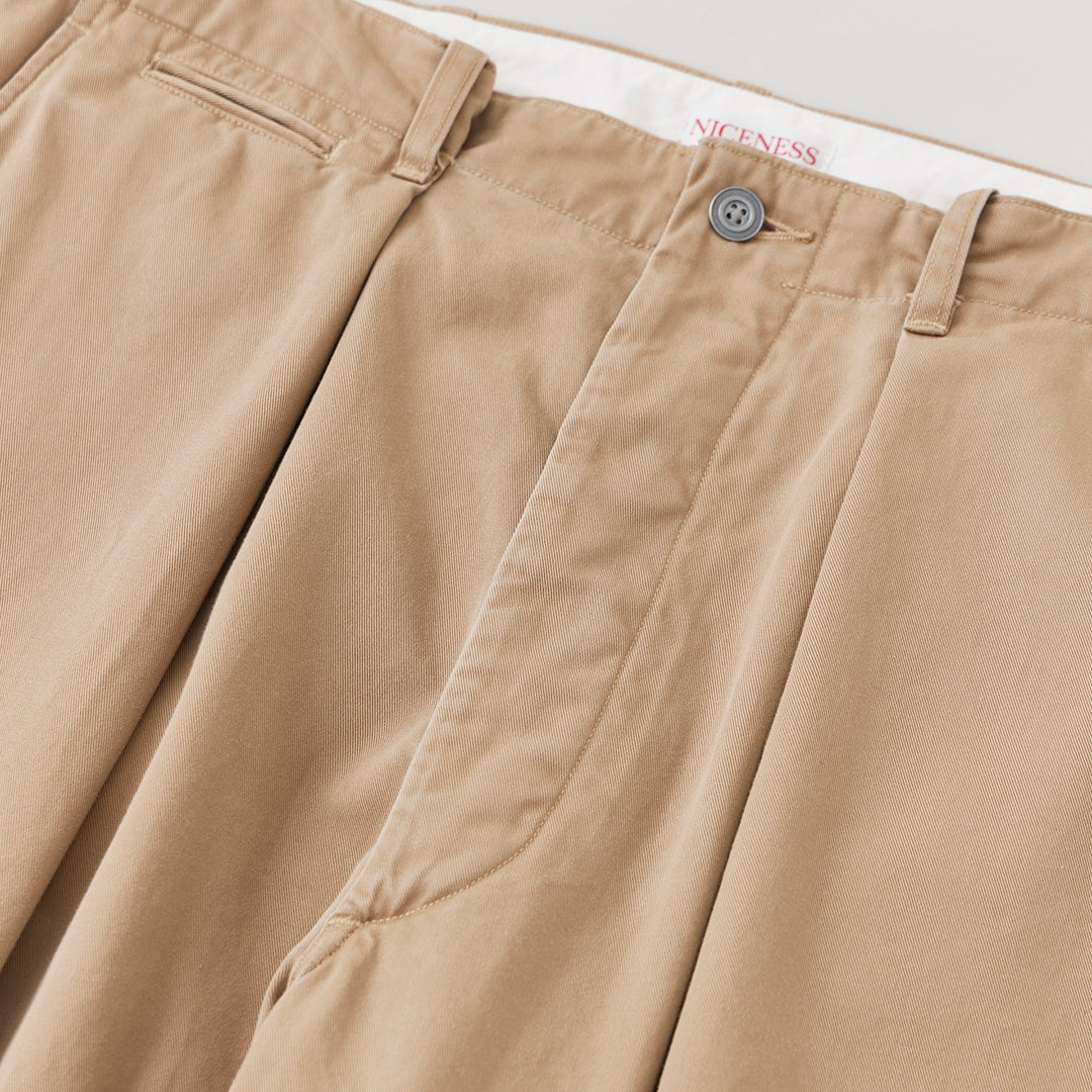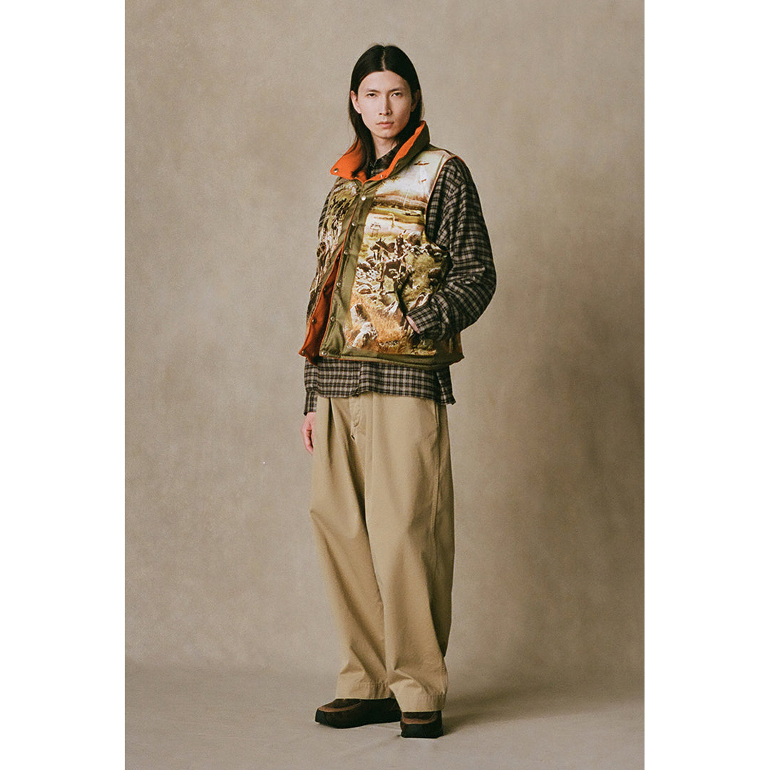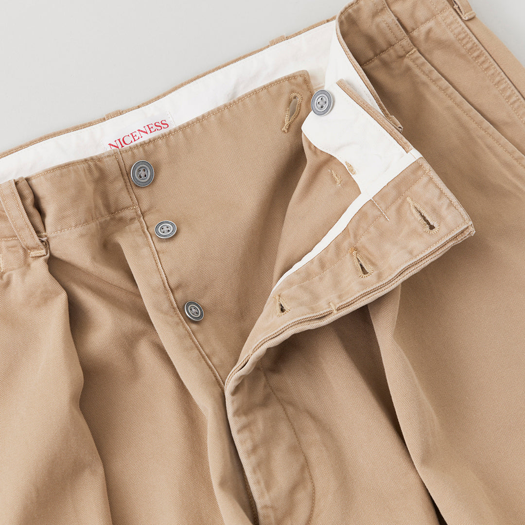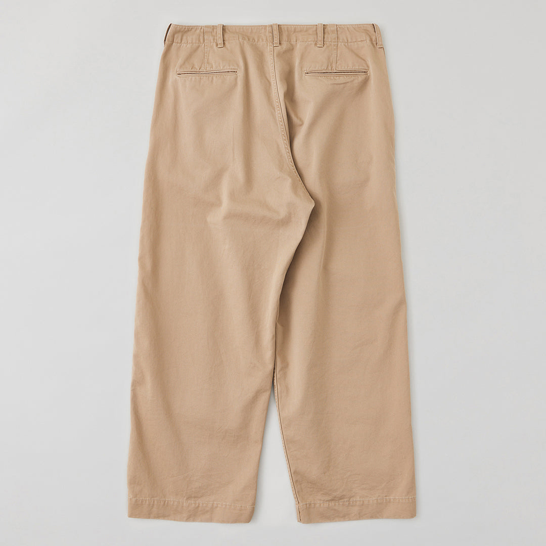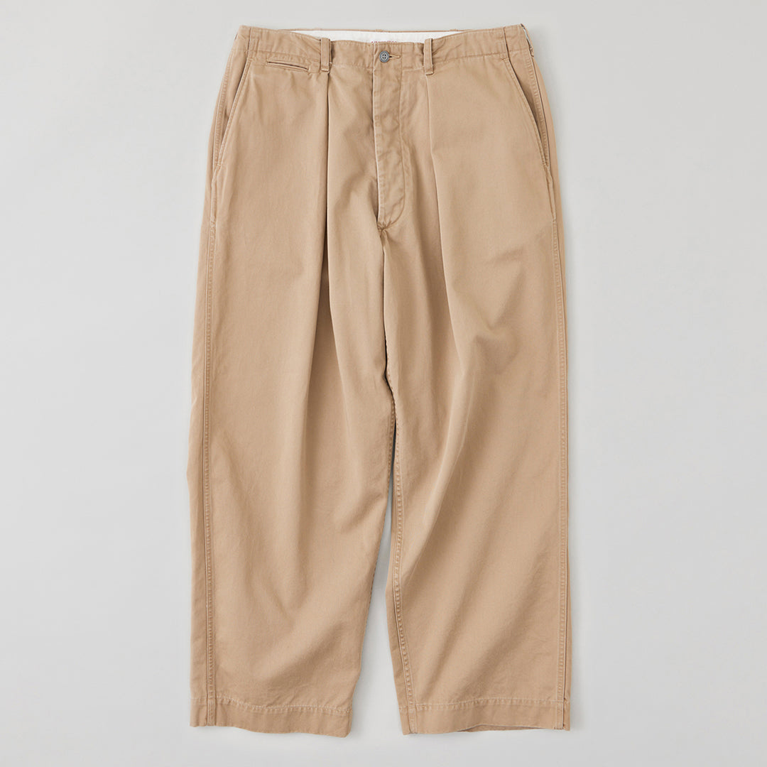 Trousers made from custom-woven chino cloth inspired by 1950s‒60s military styles, finished with a vintage look through special processing. Referencing 1940s military chinos, the design is reconstructed with distinctive patterning, including folded waist tucks for added shape.