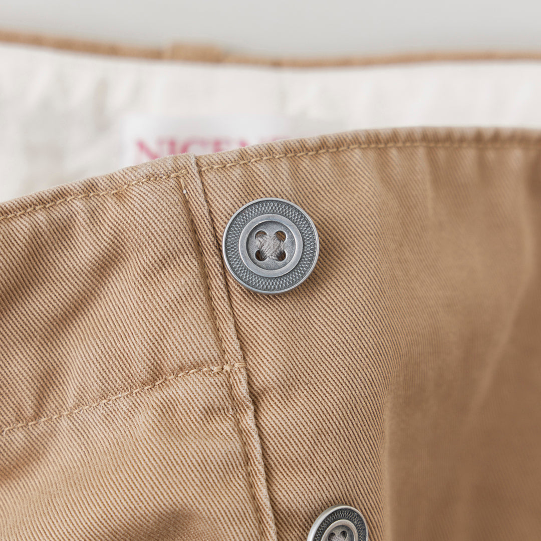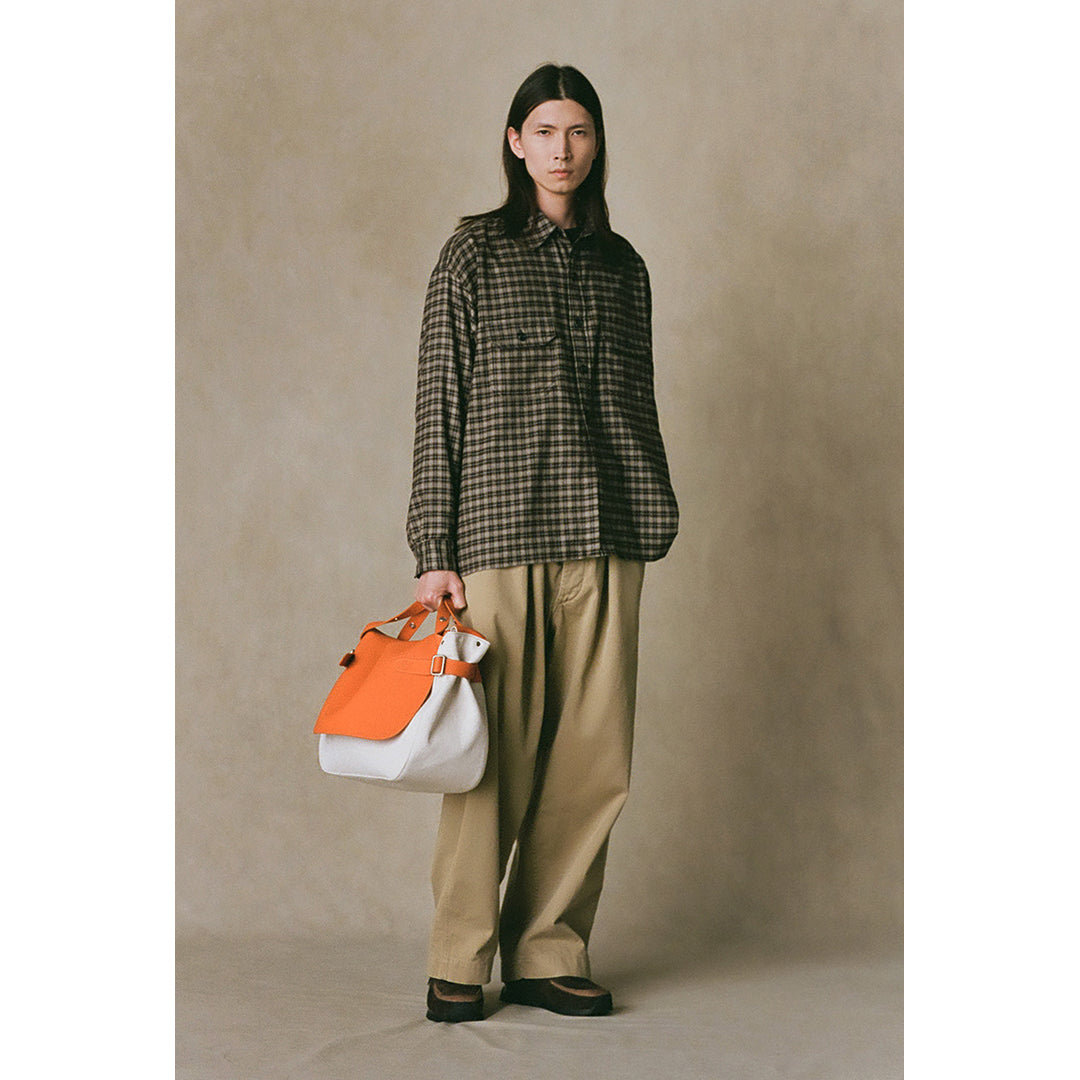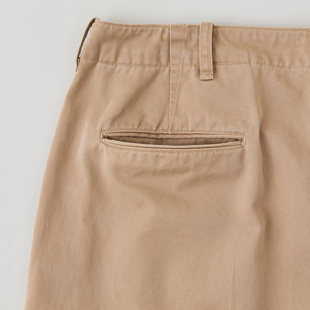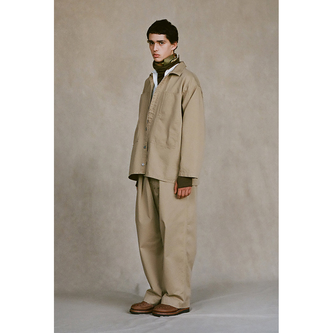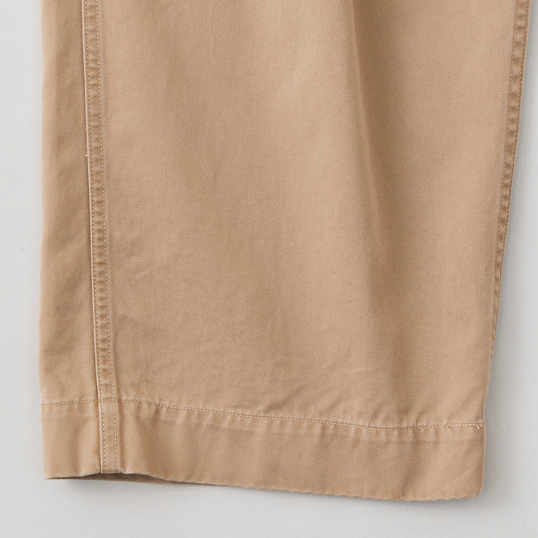 1940年代のミリタリーチノをベースに、ウエストで折り返してタックを作るなどの再構築を加えた独⾃のパターンを採⽤。エイジング加⼯を施すことで、⽣地に柔らかさと膨らみが加わり、豊かな表情を持たせています。