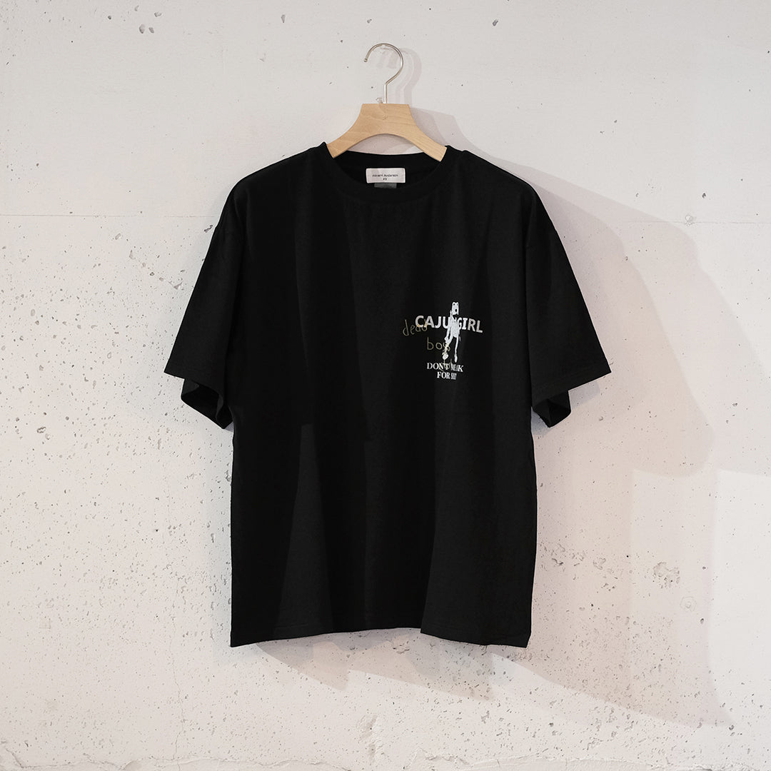 着丈は短く身幅は広めで夏場に1枚でラフに着られるシルエット。架空のバンドTやスーベニアTを意識したようなポップ感あるデザインに、オリジナルの丸胴ボディに裾や袖は天地引きステッチでクラシックな表情もあり、なんとも絶妙なバランスに仕上がっています。