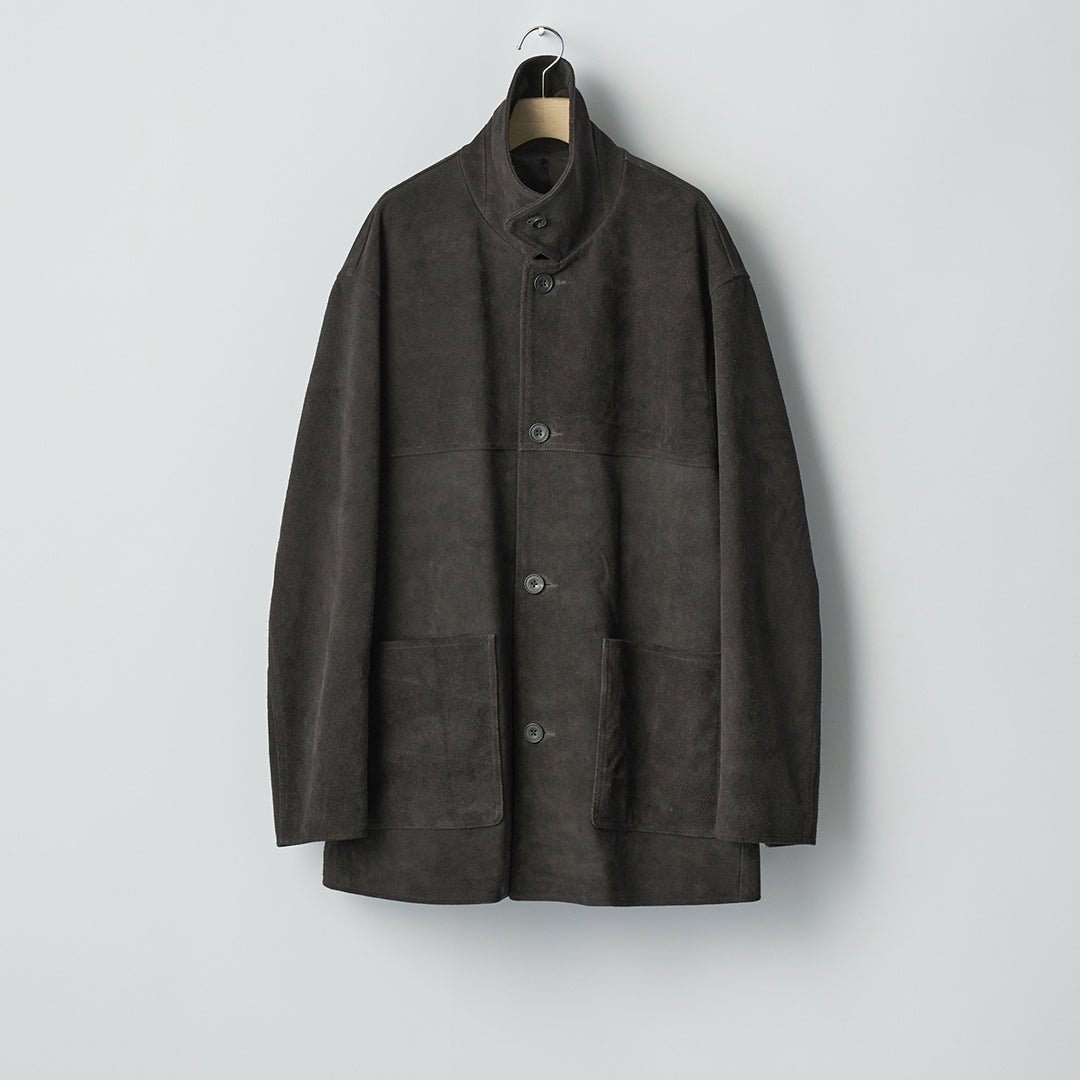 柔らかくしなやかな風合いの牛革スエードを使用したカージャケットはダークブラウンをセレクト。ミニマルでモダンなシルエット、全体感になるよう各パターン、ステッチを設定しています。