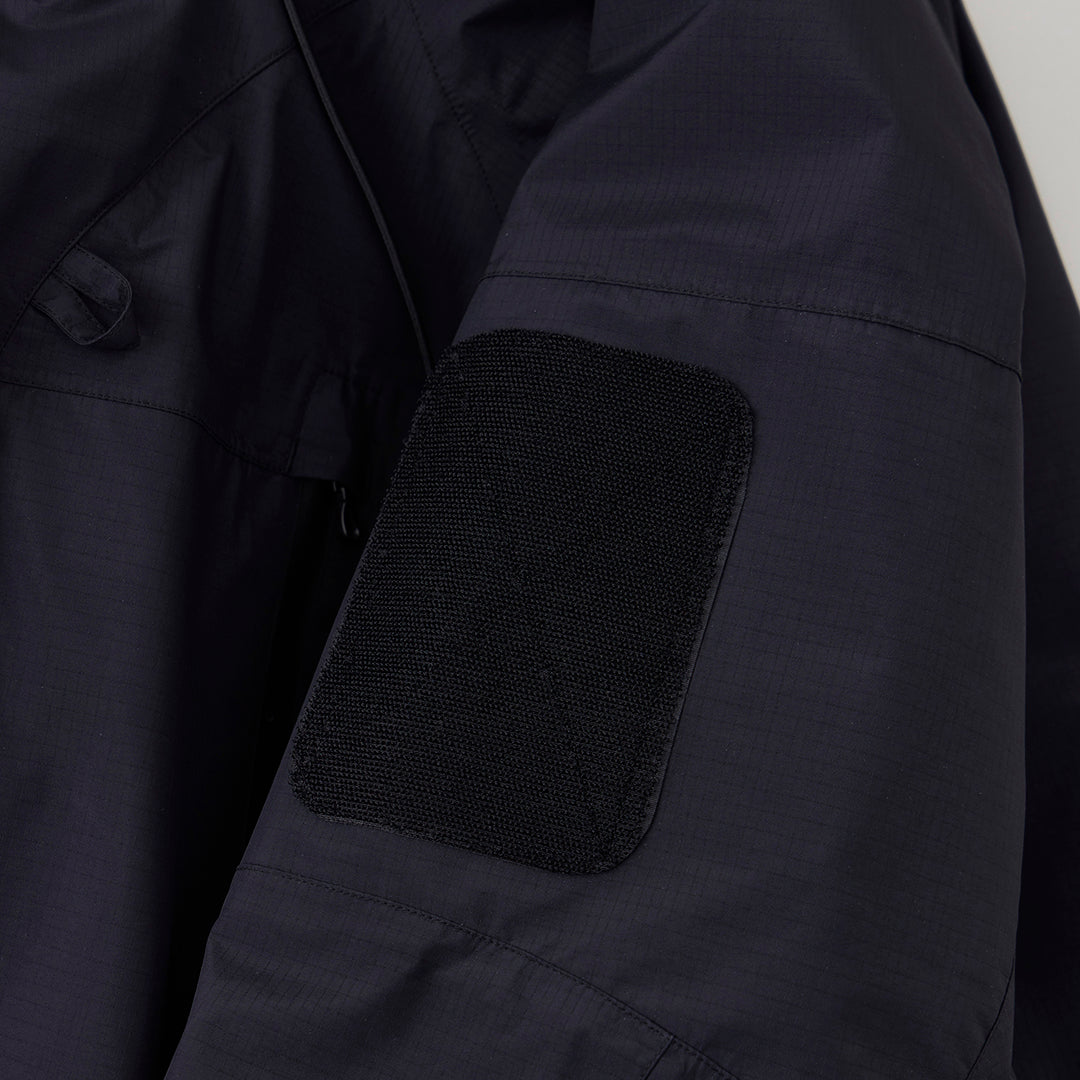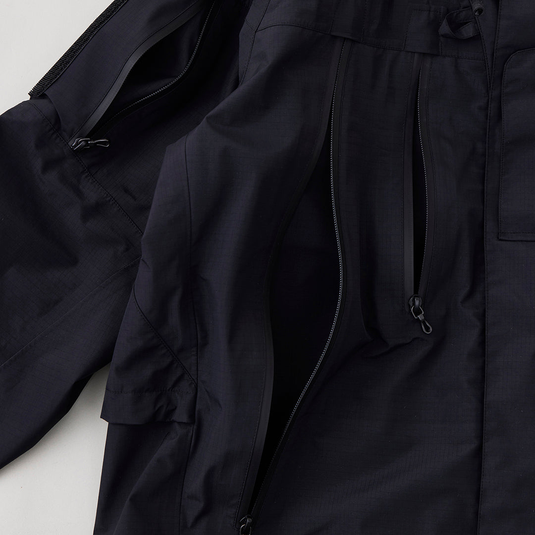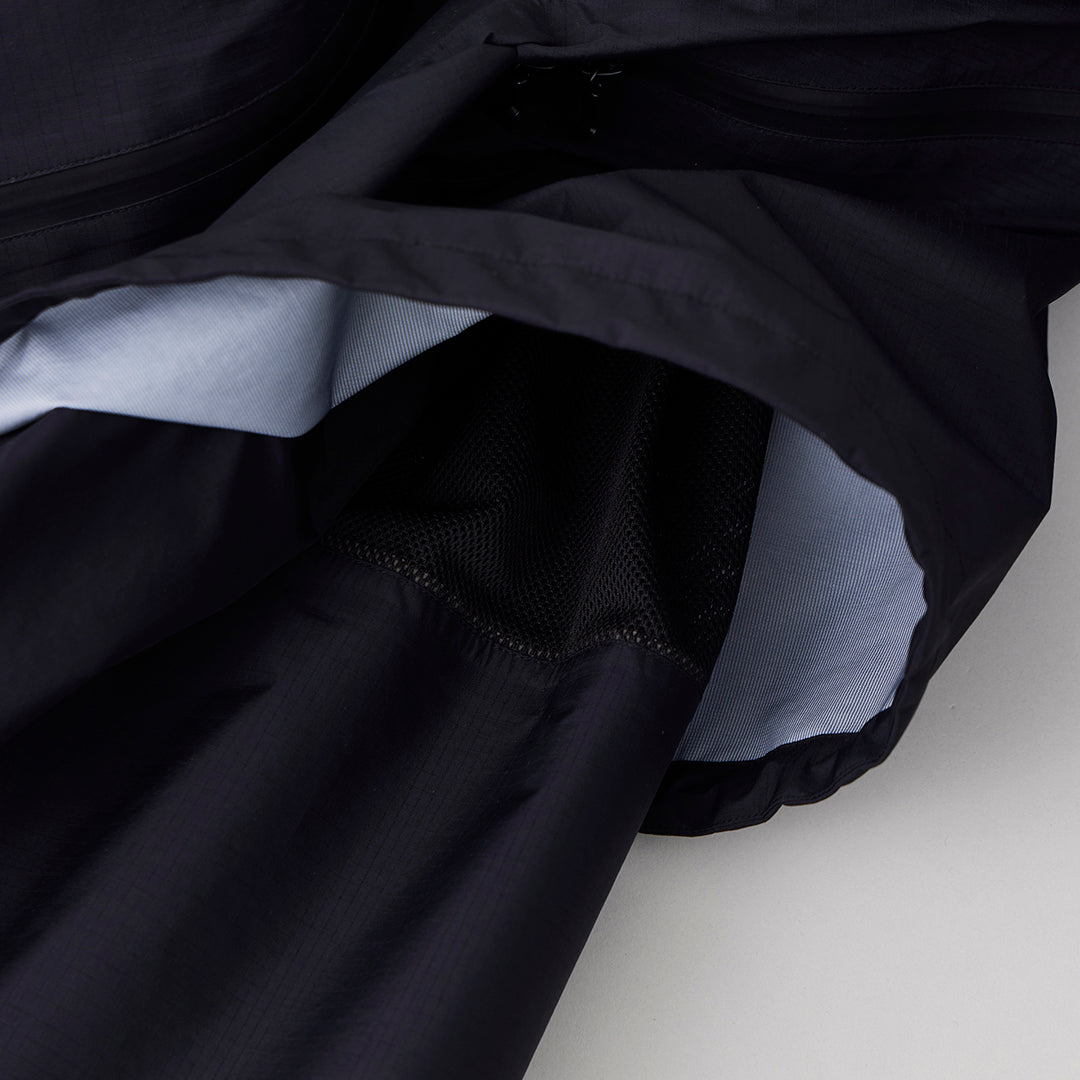 Royal Air Forceのジャケット「ROYAL NAVY UPPER DECK SUIT JACKET」をリファレンスに、随所のディテールをアップデートしています。⼆重構造となった背中は、メッシュ素材の上から3 レイヤー⽣地で覆う仕様となっており、脇下のベンチレーションと併せて⾼い通気性を実現。フードは襟に収納可能で、裾を絞るためのアジャスターコードはポケット内に格納されています。