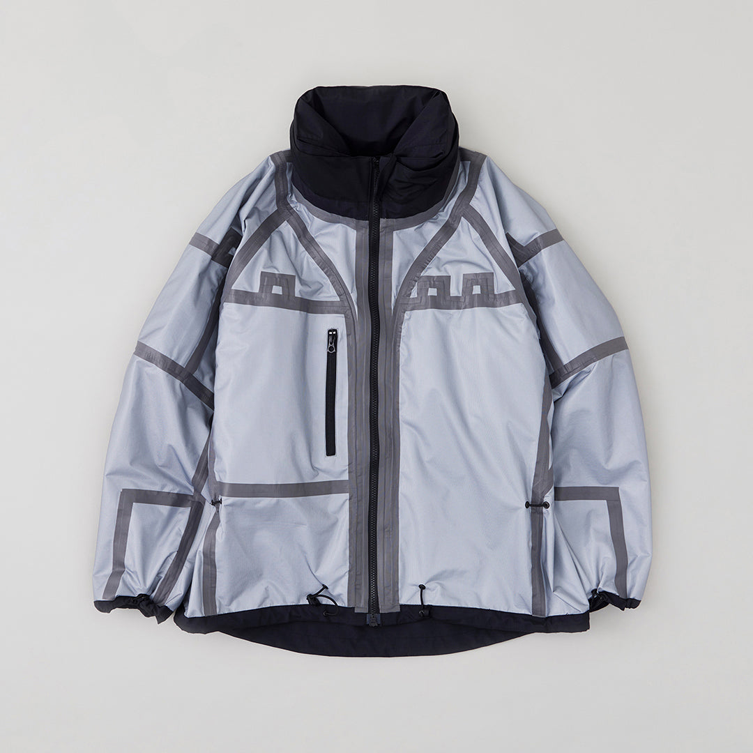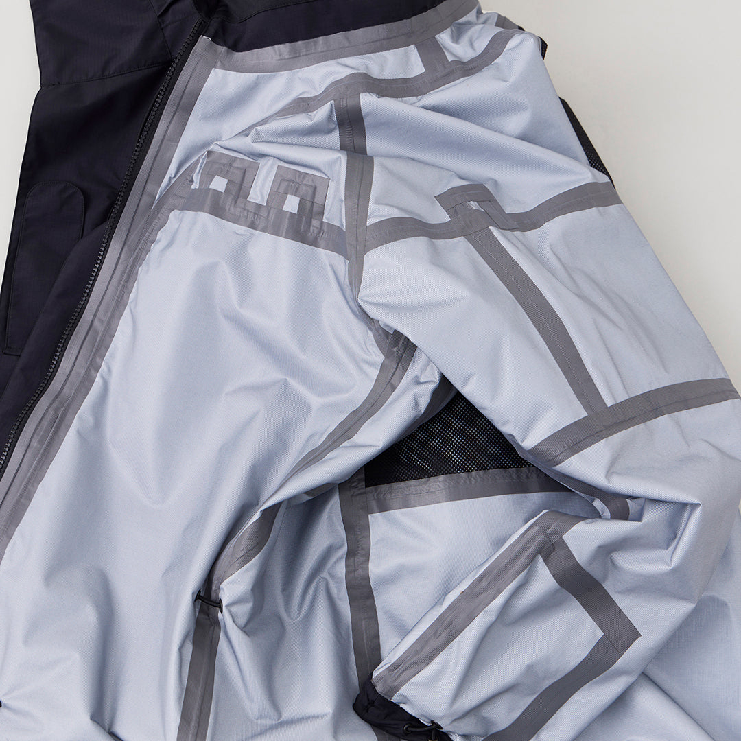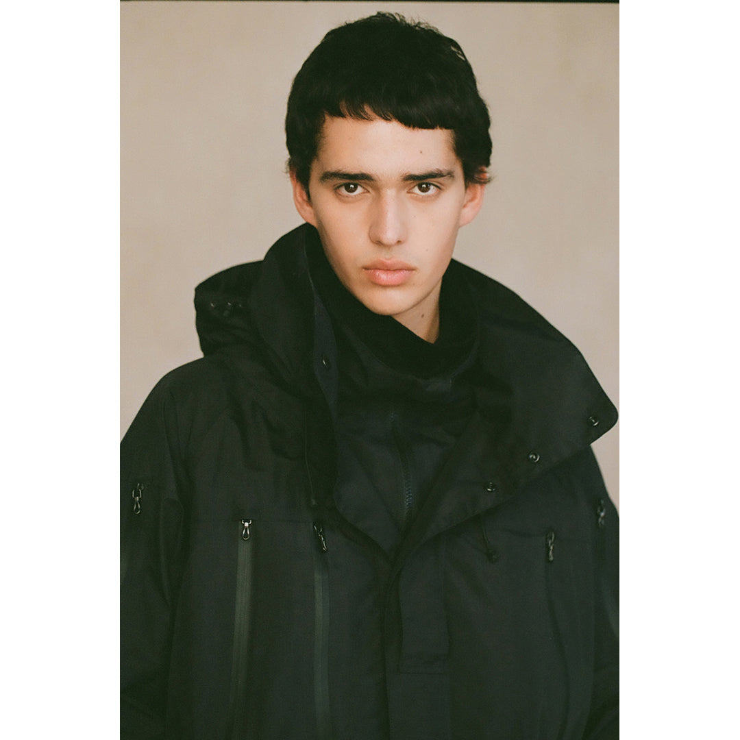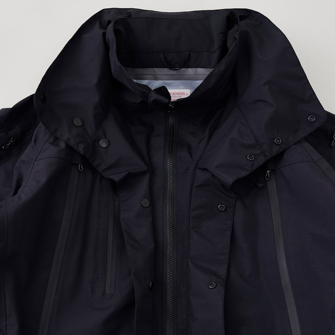 Royal Air Forceのジャケット「ROYAL NAVY UPPER DECK SUIT JACKET」をリファレンスに、随所のディテールをアップデートしています。⼆重構造となった背中は、メッシュ素材の上から3 レイヤー⽣地で覆う仕様となっており、脇下のベンチレーションと併せて⾼い通気性を実現。フードは襟に収納可能で、裾を絞るためのアジャスターコードはポケット内に格納されています。