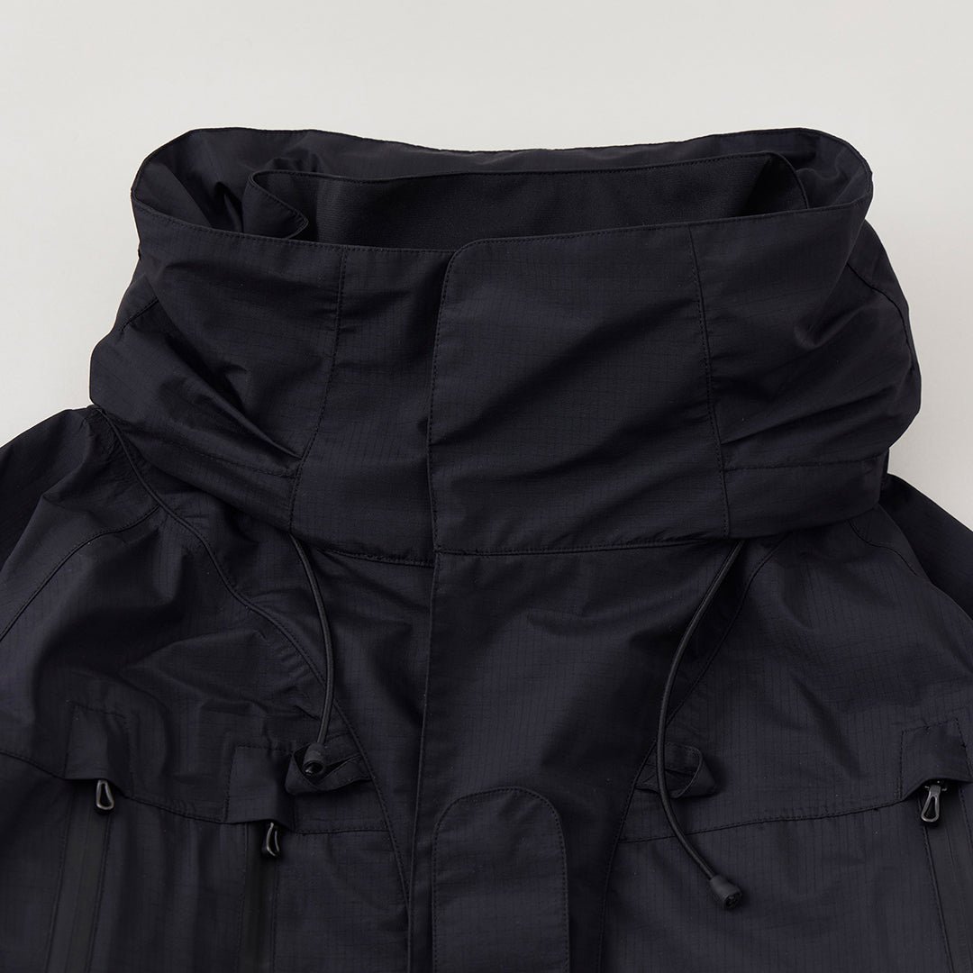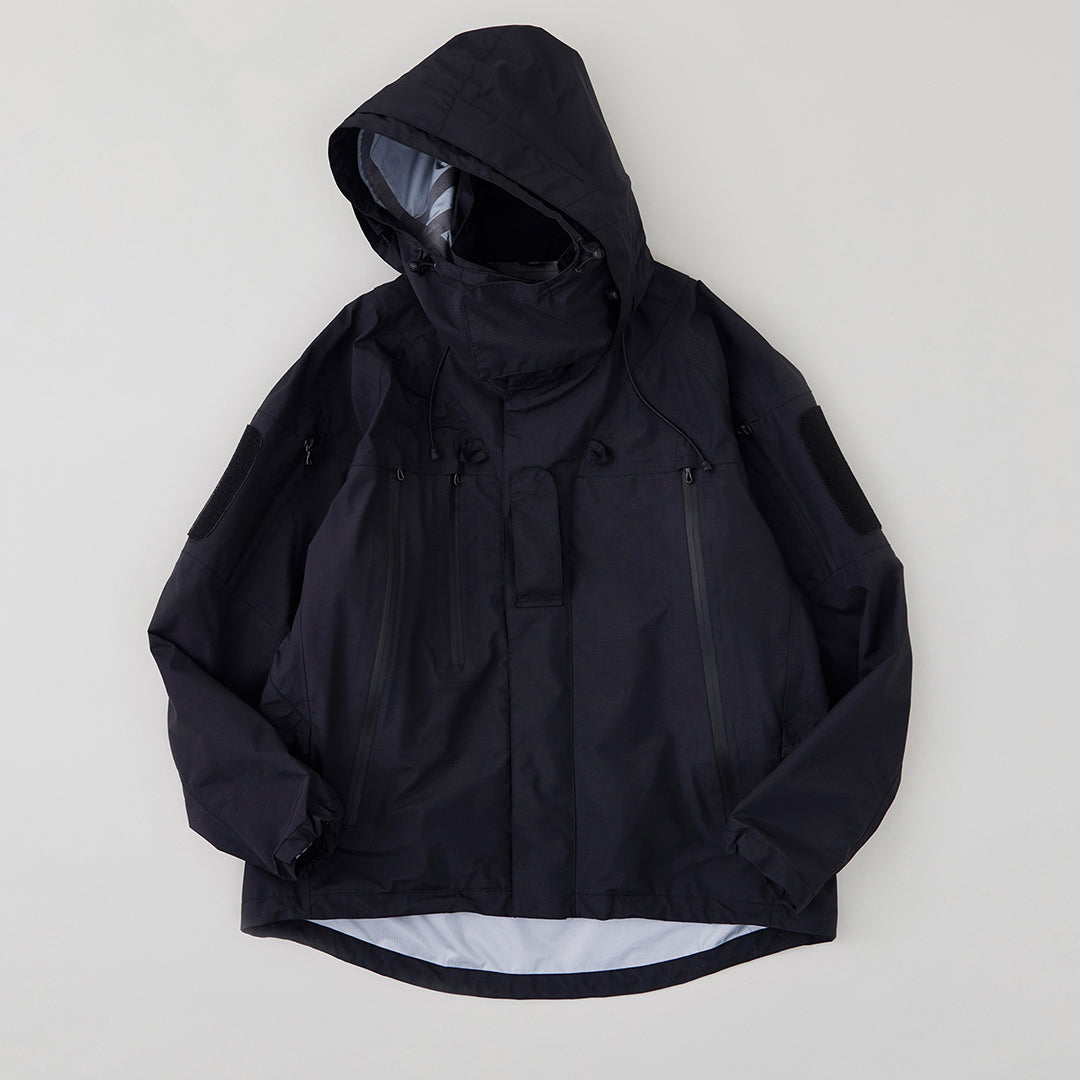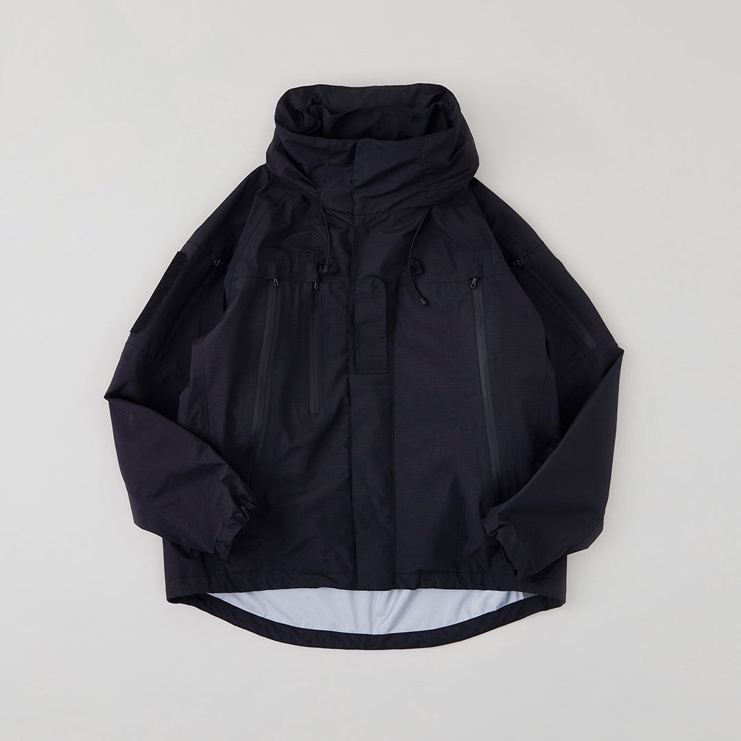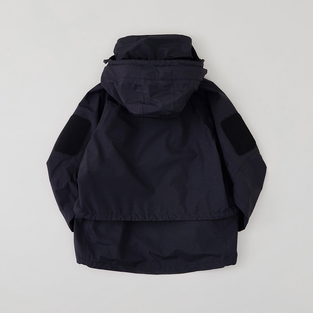 A tactical jacket made from deadstock 3-layer nylon ripstop fabric originally developed for military use. Drawing reference from the Royal Air Forceʼs “ROYAL NAVY UPPER DECK SUIT JACKET,” its detailing has been updated throughout. The back features a dual-layer construction with mesh covered by the 3-layer shell, while additional ventilation under the arms enhances breathability. The hood can be stowed into the collar, and an adjustable drawcord for the hem is stored discreetly inside the pockets.