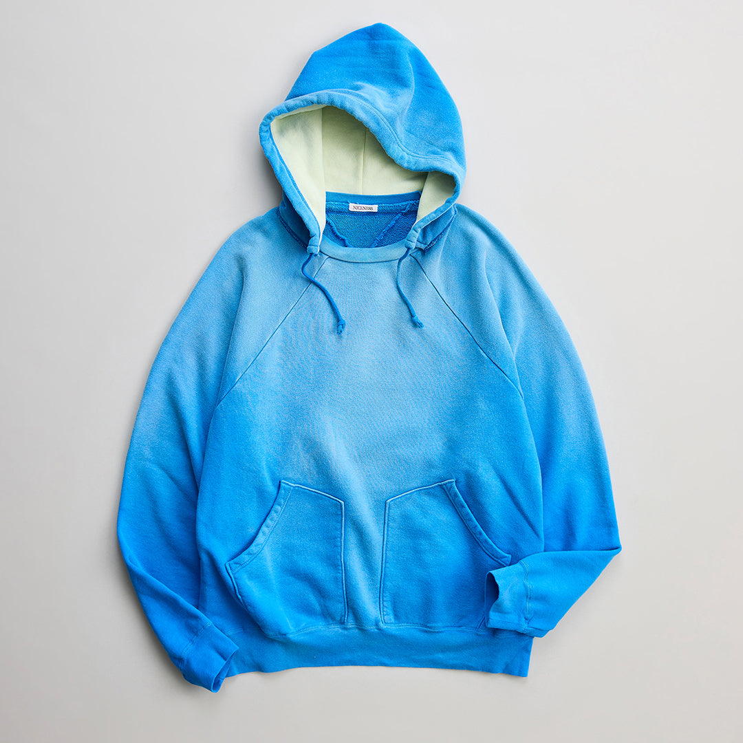 型は1970年代のスポーツスウェットフーディをリファレンスとし、2枚仕立てのフードや襷掛けのバックスタイルから着想を得たオリジナルカッティング。製品後には熟練職人による手作業のエイジング加工を施し、着古したような佇まいを演出しています。クラシックなルーツを持ちながらも現代の技術と感性で再構築し、平面的にならないヴィンテージライクな深みを加えています。ふくらみと柔らかさを併せ持つ独特な風合いが魅力の一着。