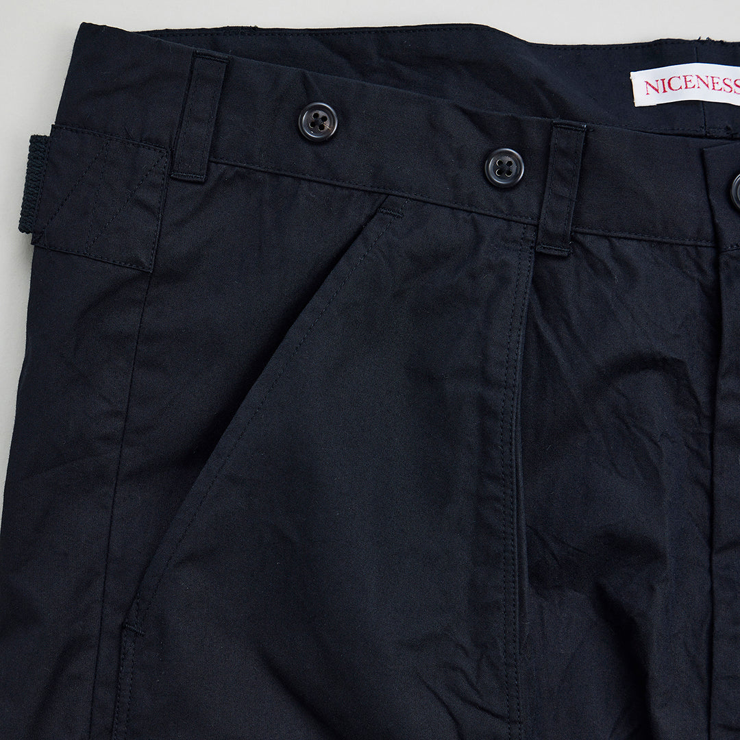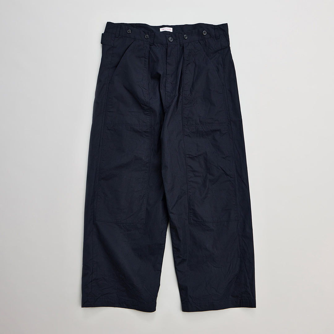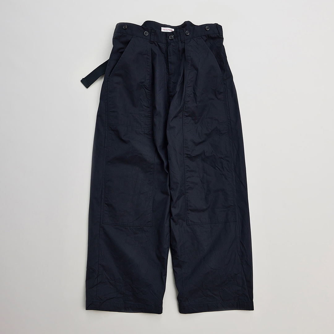 細番手の超長綿を限界まで高密度に打ち込んだ、ナイスネスオリジナルのベンタイルリファレンス生地を使用し、70sのワークウェアに多く見られたダブルニーディティールを取り入れたトラウザー。
