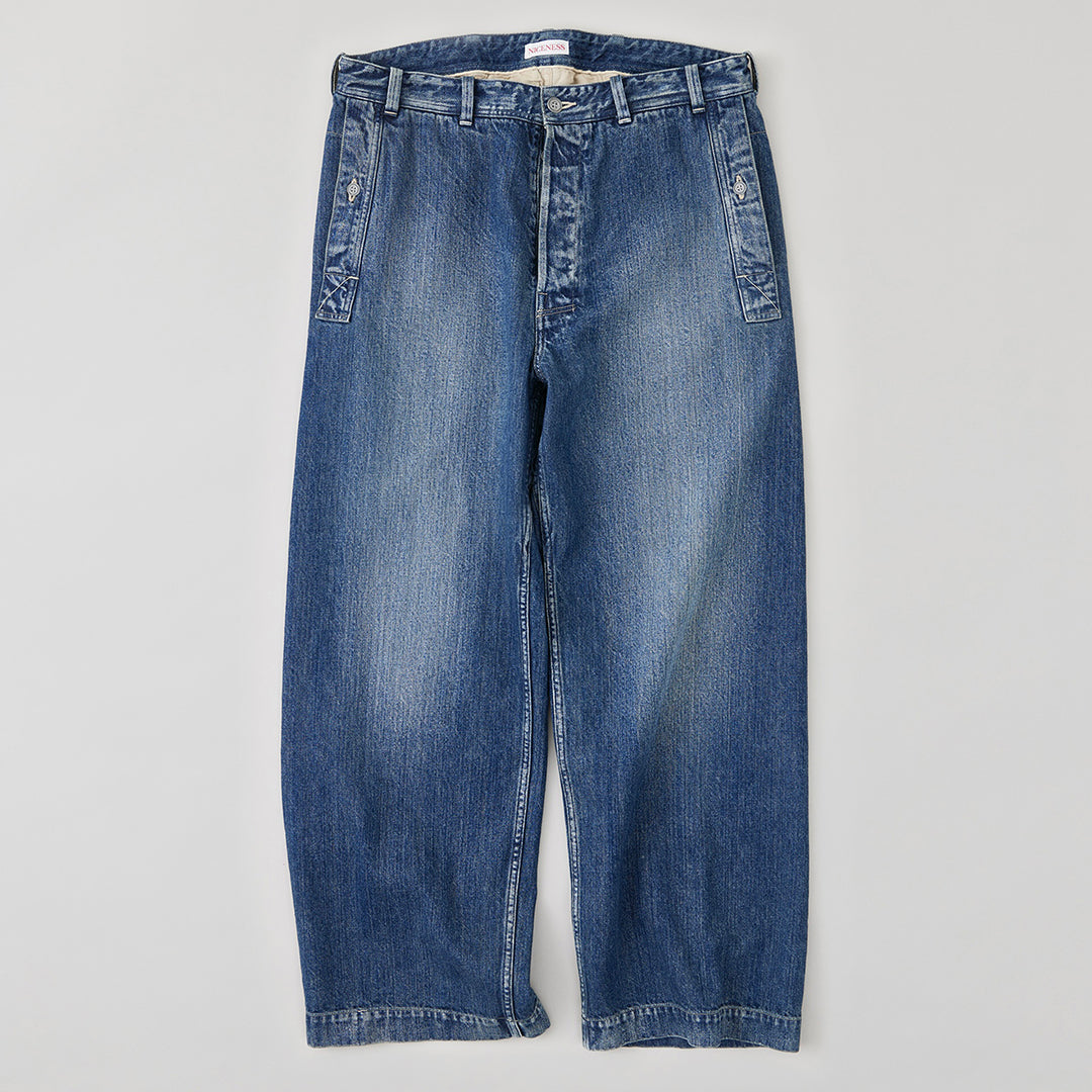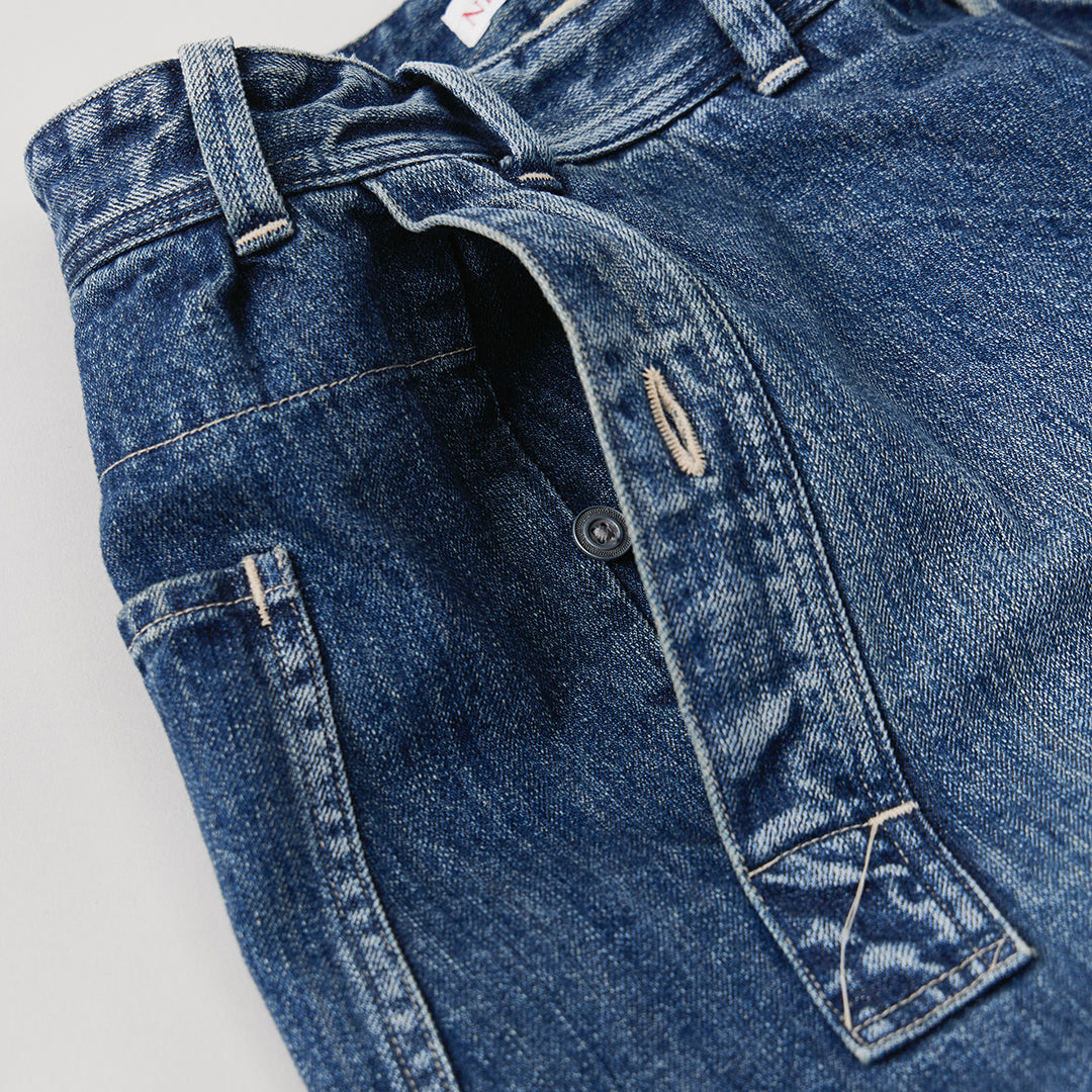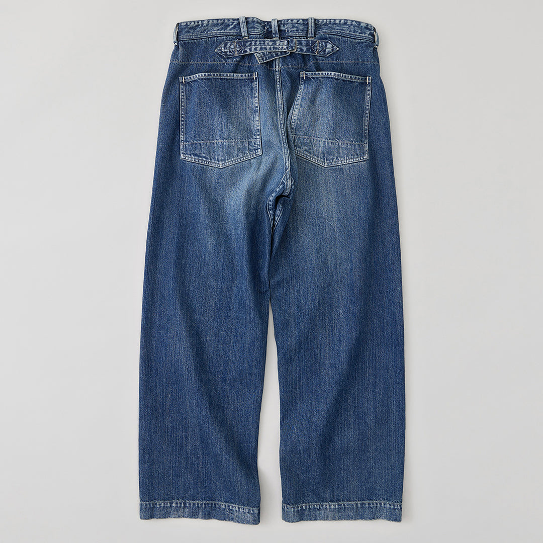 1920年代〜30年代の米国陸軍のデニムトラウザーをリファレンスとし、ワークパンツに見られるポケットディテールなどを取り入れたデザインです。生地はシャトル織機で丁寧に織り上げた、肉厚過ぎず軽過ぎない柔らかく着心地が良い仕上がり。着用を重ねたようなヴィンテージ感のあるタテ落ちを表現するため職人による製品加工を施しています。
