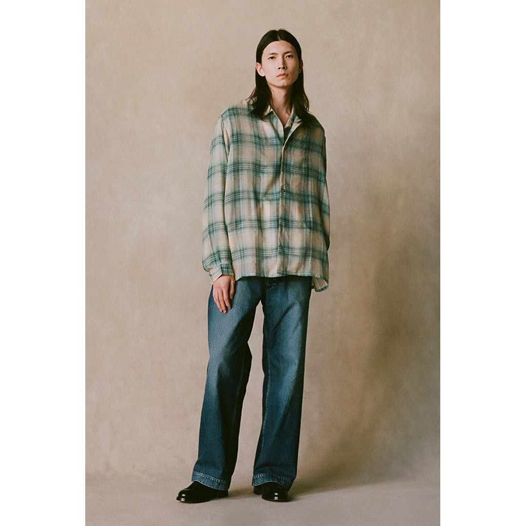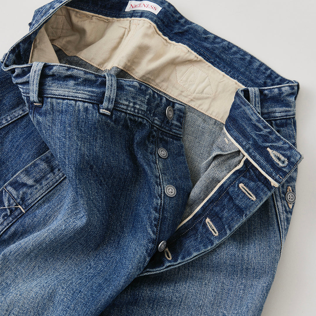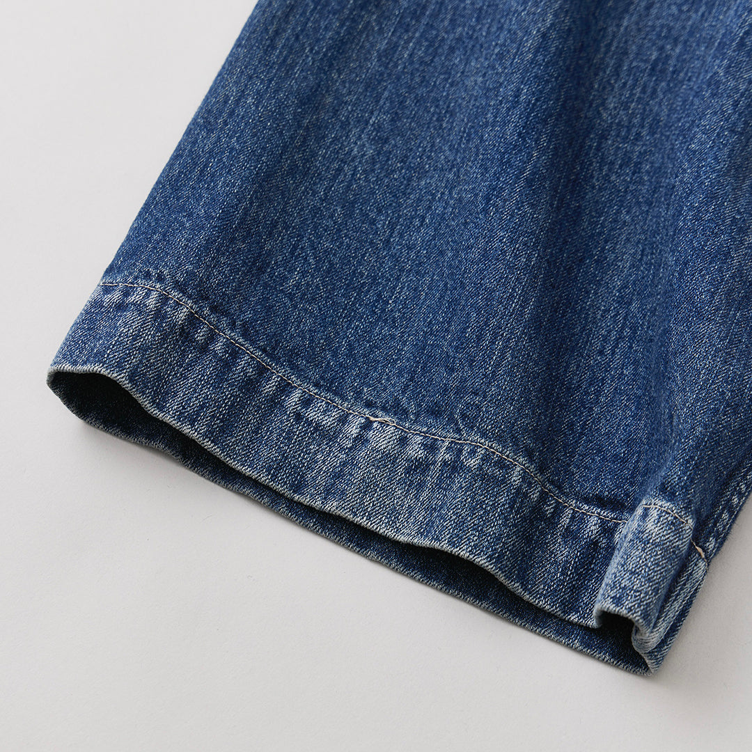 1920年代〜30年代の米国陸軍のデニムトラウザーをリファレンスとし、ワークパンツに見られるポケットディテールなどを取り入れたデザインです。生地はシャトル織機で丁寧に織り上げた、肉厚過ぎず軽過ぎない柔らかく着心地が良い仕上がり。着用を重ねたようなヴィンテージ感のあるタテ落ちを表現するため職人による製品加工を施しています。