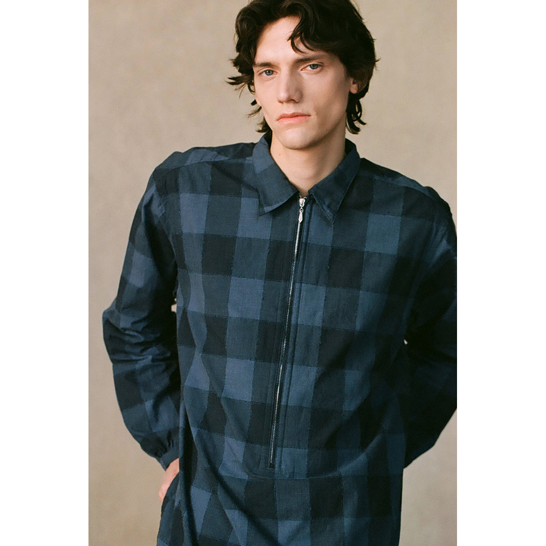 A long zip pullover shirt crafted from a variety of deadstock fabrics sourced from a now-closed Italian shirting mill, once cherished for its exceptional quality. Based on the pattern construction of 1940s dress shirts, the design has been reimagined for easy, standalone casual wear. The fabrics were produced entirely in-house by a rare, vertically integrated manufacturer, making them nearly impossible to reproduce today. This piece allows you to fully appreciate the distinctive character, texture, and nuanced color combinations that only deadstock materials can offer.