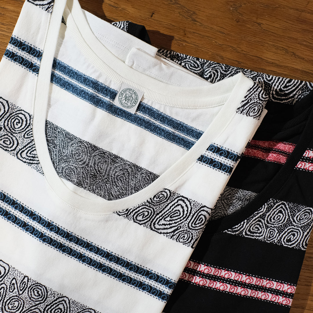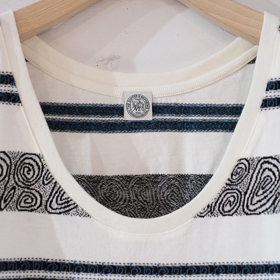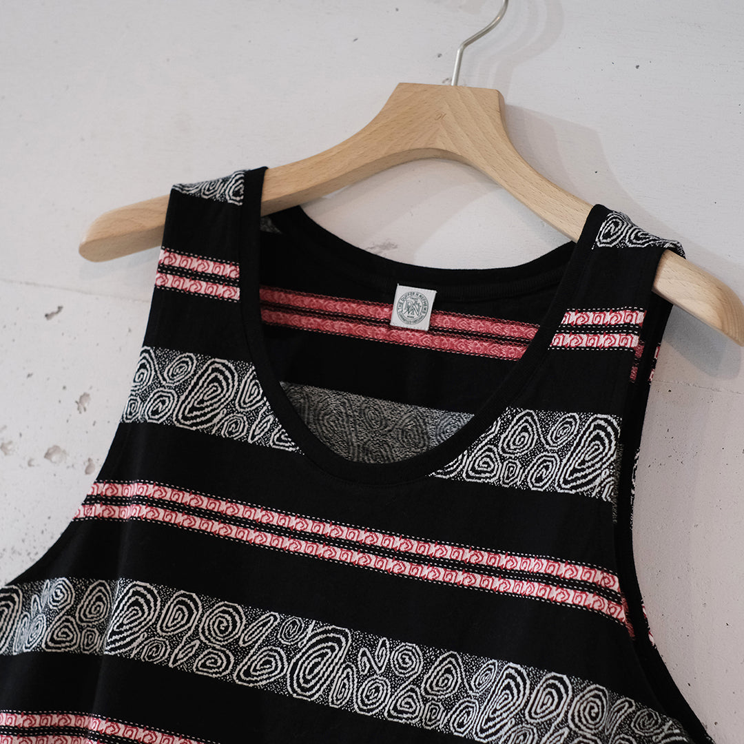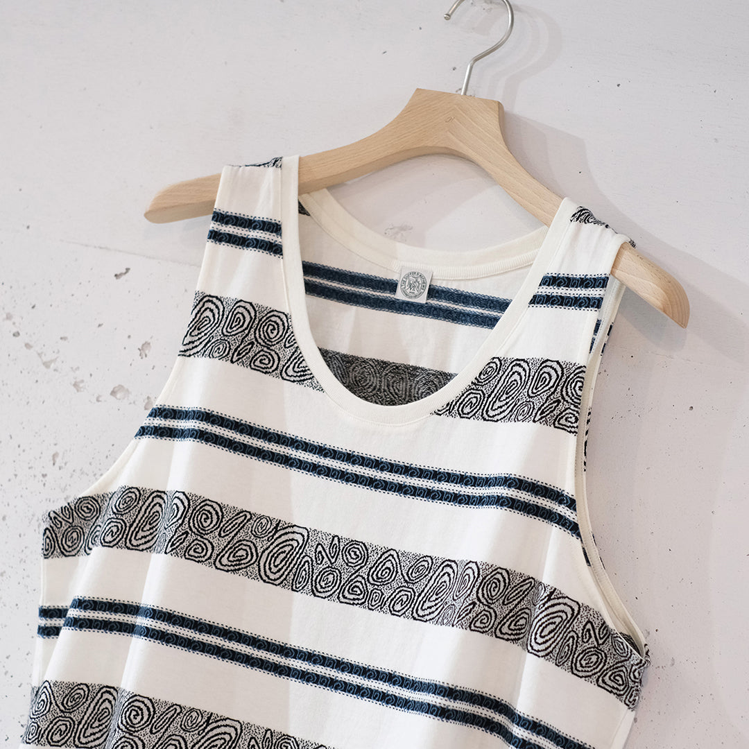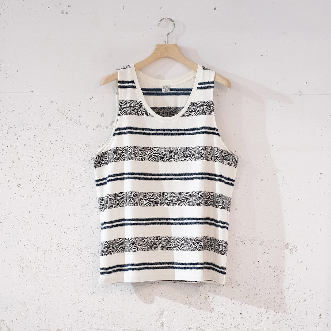 1990sのスケーターTシャツなどをイメージし制作したジャガードボーダー柄タンクトップ。ジャカード織りにより深みのある表情に仕上がっています。90sのスケートライダーたちがヒップホップシーンと絡み合い、映像や雑誌、ファッションでカルチャーを作り上げていった“あの時代”を意識しつつ、当時の空気感と現代のムードを掛け合わせたアイテムです。