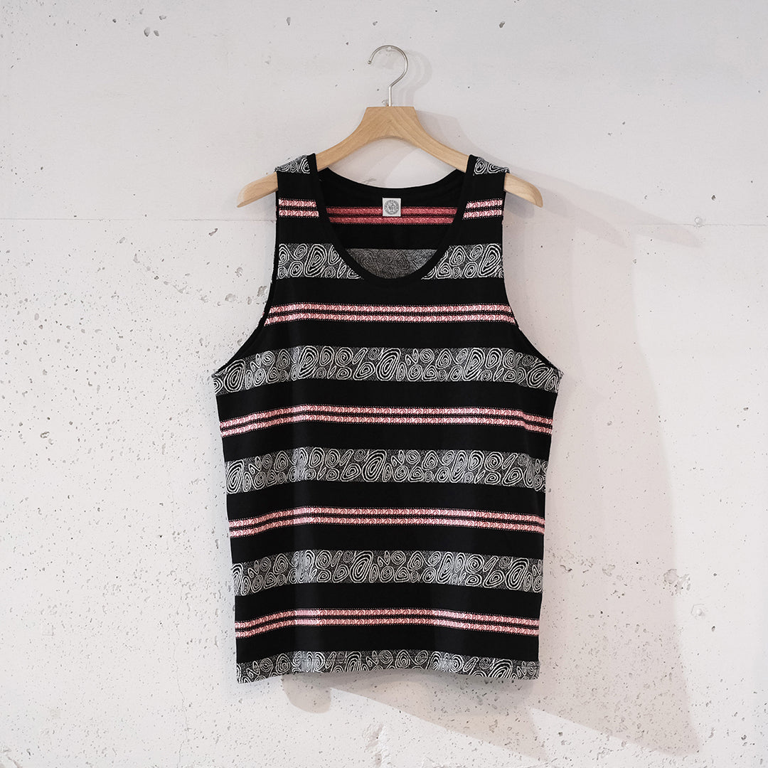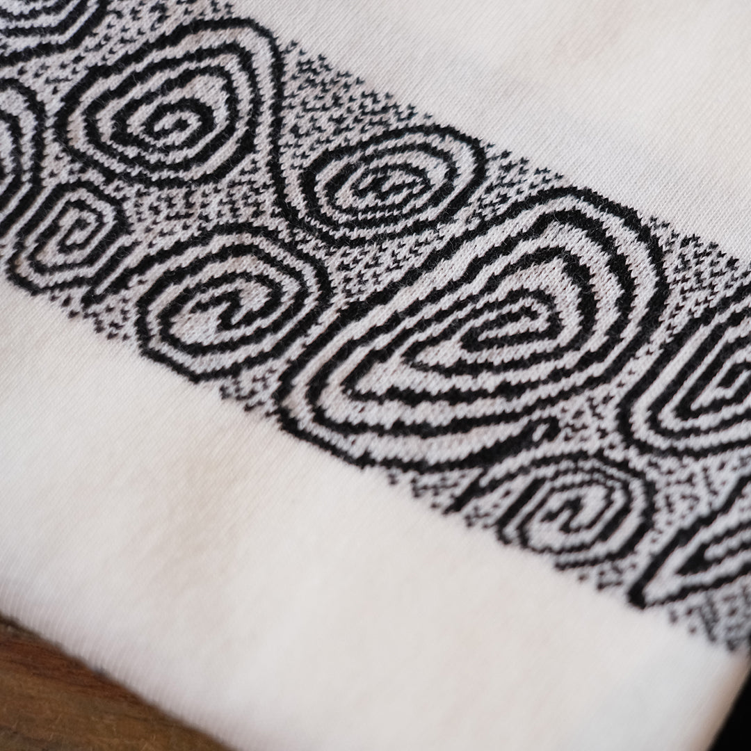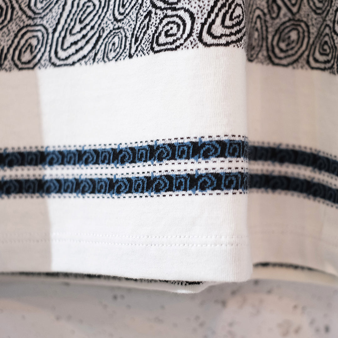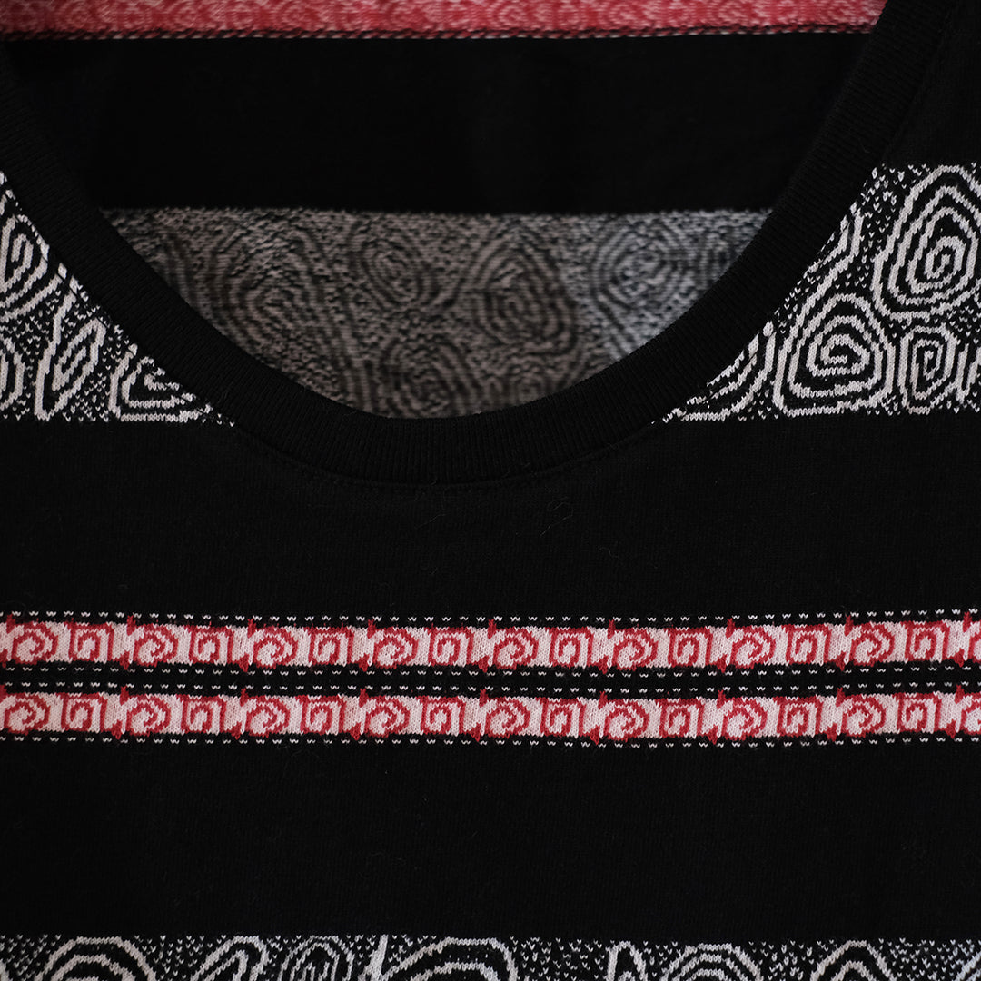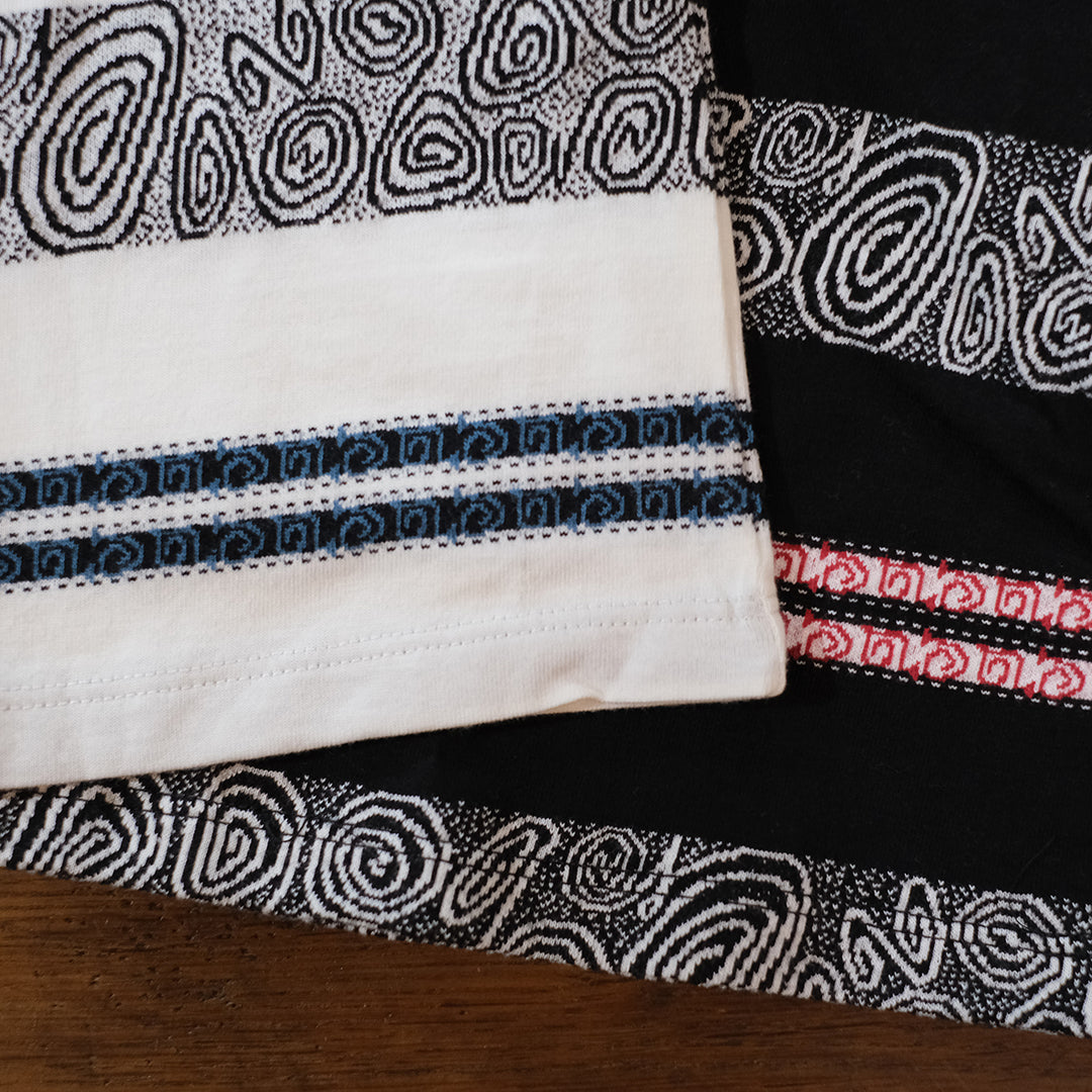 1990sのスケーターTシャツなどをイメージし制作したジャガードボーダー柄タンクトップ。ジャカード織りにより深みのある表情に仕上がっています。90sのスケートライダーたちがヒップホップシーンと絡み合い、映像や雑誌、ファッションでカルチャーを作り上げていった“あの時代”を意識しつつ、当時の空気感と現代のムードを掛け合わせたアイテムです。