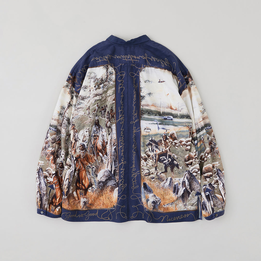 1950年代のデニムジャケットのパターン構成をリファレンスとしシャツライクに着回せるデザインです。オリジナル柄は1950年代〜60年代のレーヨンギャバ生地からインスピレーションを受け、職人が13版を手捺染にてプリントしています。高揚感や緊張感、時にはユーモアや示唆を与えられるようシュールレアリスムのアプローチで表現しています。