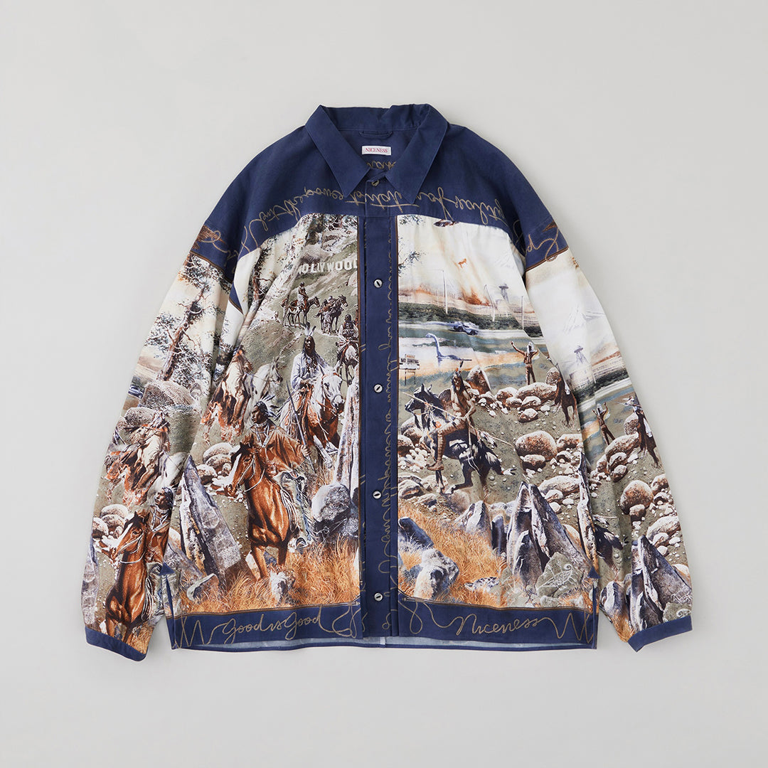オリジナル柄のシルクスクリーンプリントを施したレーヨンコットン生地を使用したトラッカーシャツ。