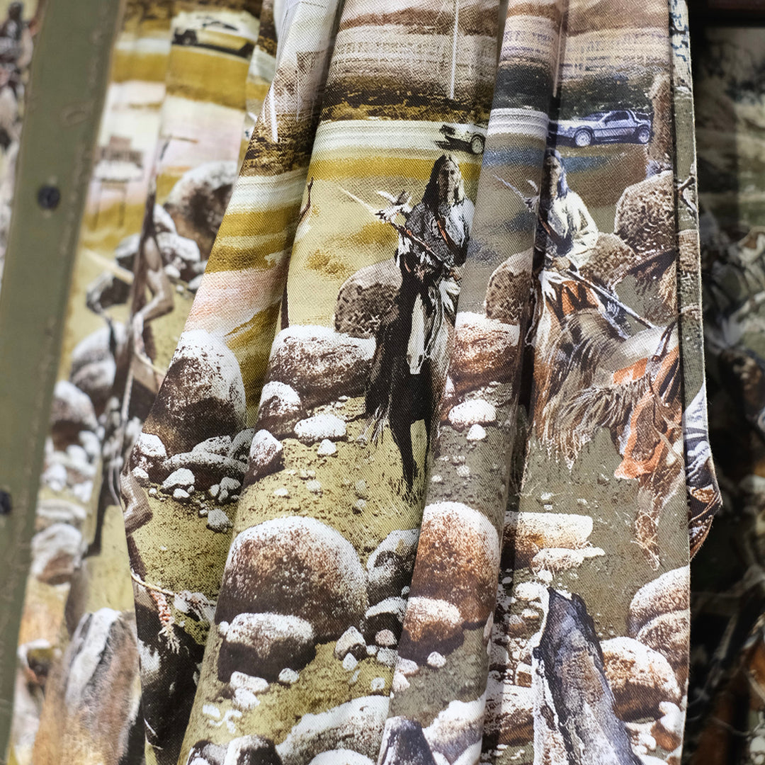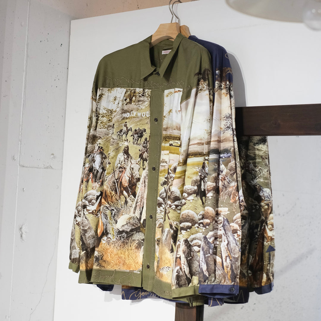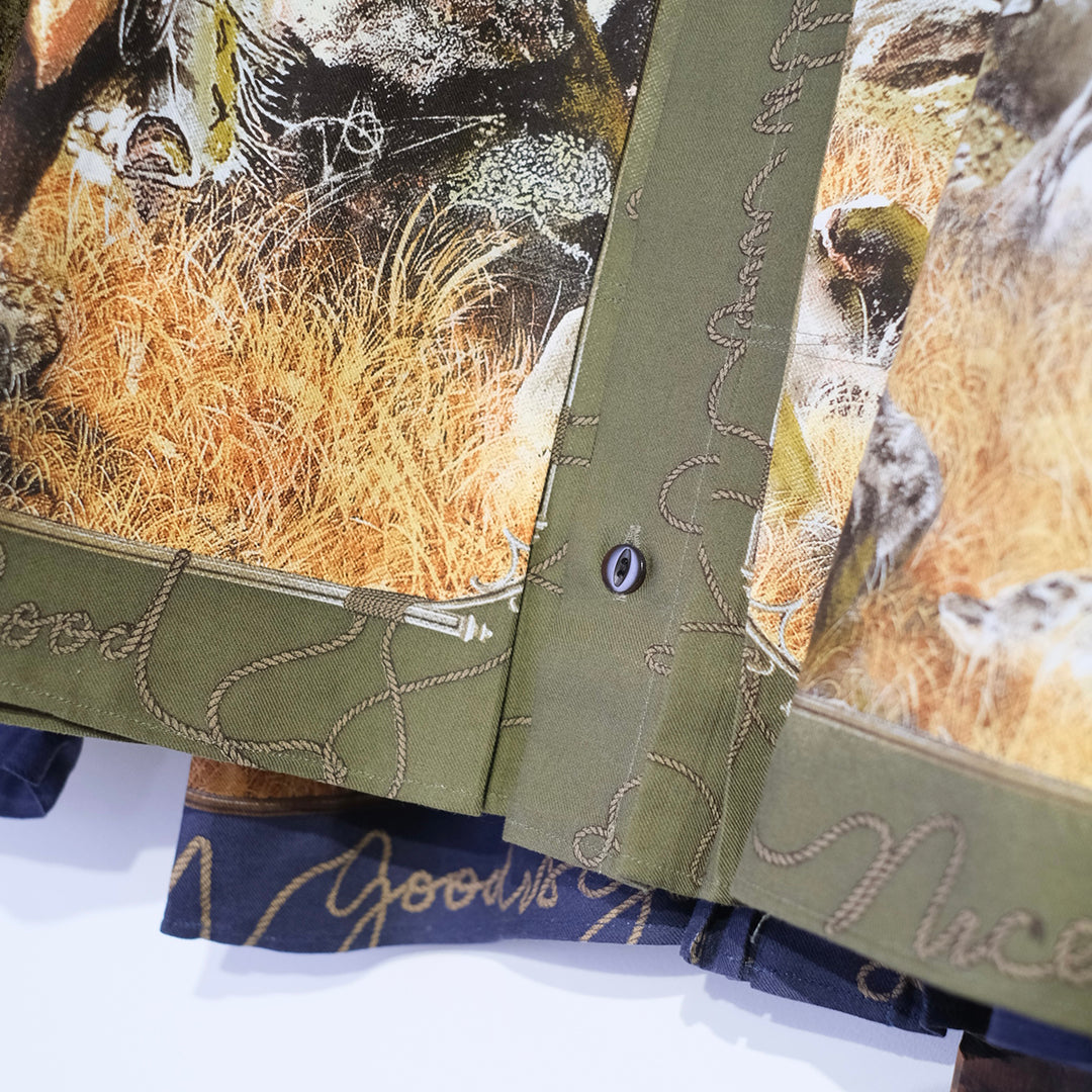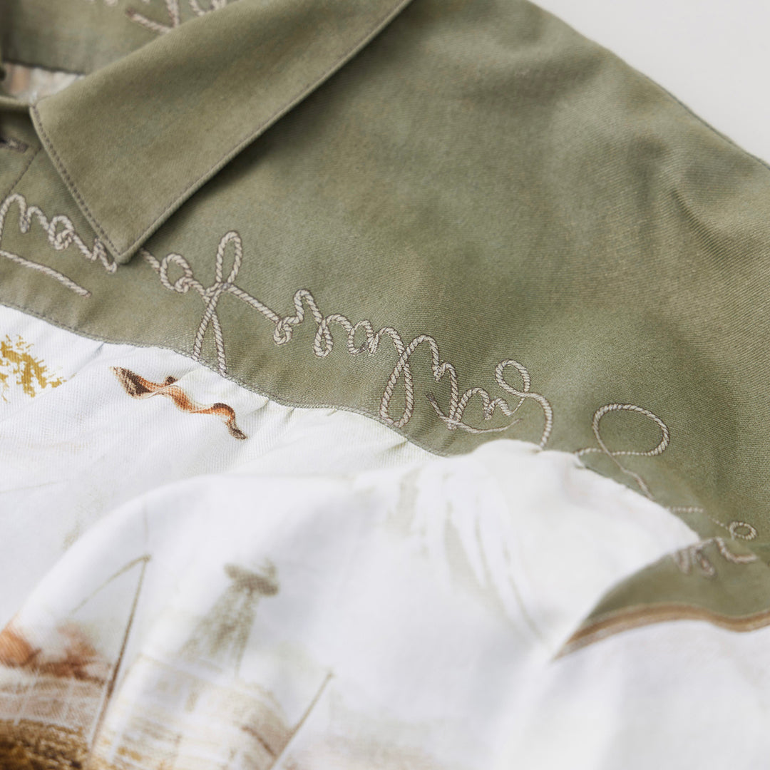 オリジナル柄のシルクスクリーンプリントを施したレーヨンコットン生地を使用したトラッカーシャツ。