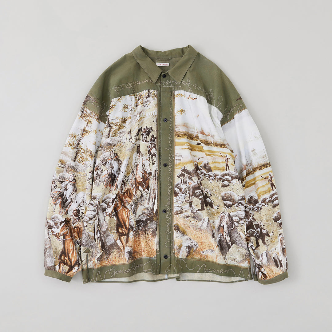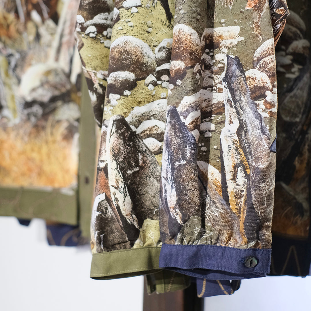 1950年代のデニムジャケットのパターン構成をリファレンスとしシャツライクに着回せるデザインです。オリジナル柄は1950年代〜60年代のレーヨンギャバ生地からインスピレーションを受け、職人が13版を手捺染にてプリントしています。高揚感や緊張感、時にはユーモアや示唆を与えられるようシュールレアリスムのアプローチで表現しています。