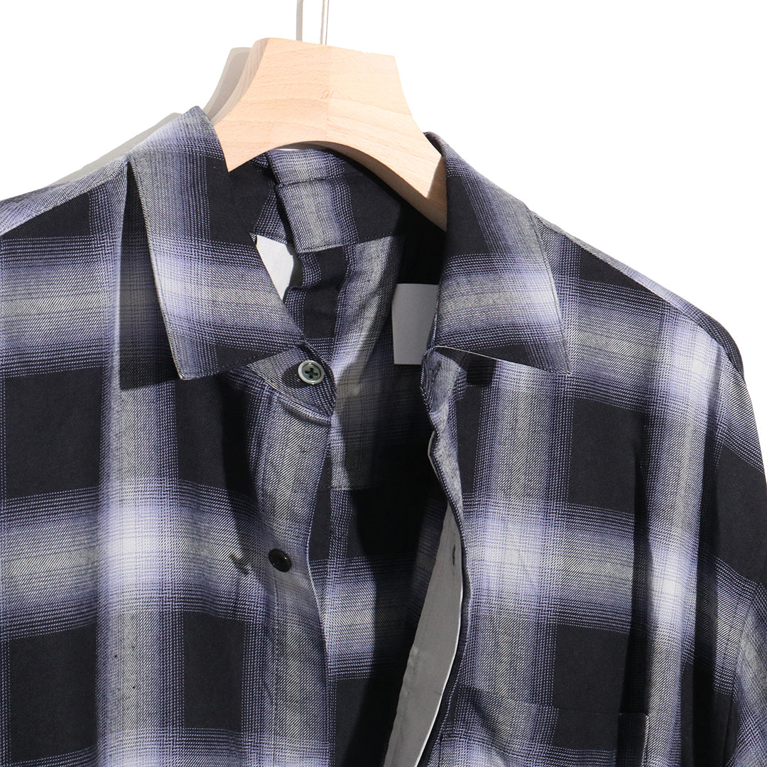 生地は経糸30/1×緯糸30/1のレーヨン100%のオンブレーチェック。100%レーヨン特有のクラシックな印象、ヴィンテージのような風合いやさらっとした軽快な着心地も魅力です。