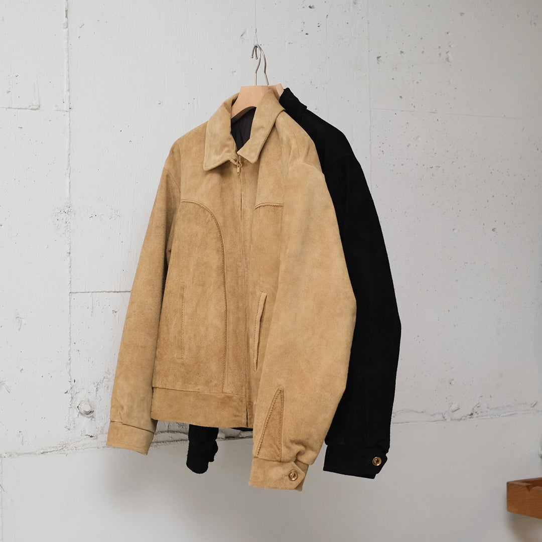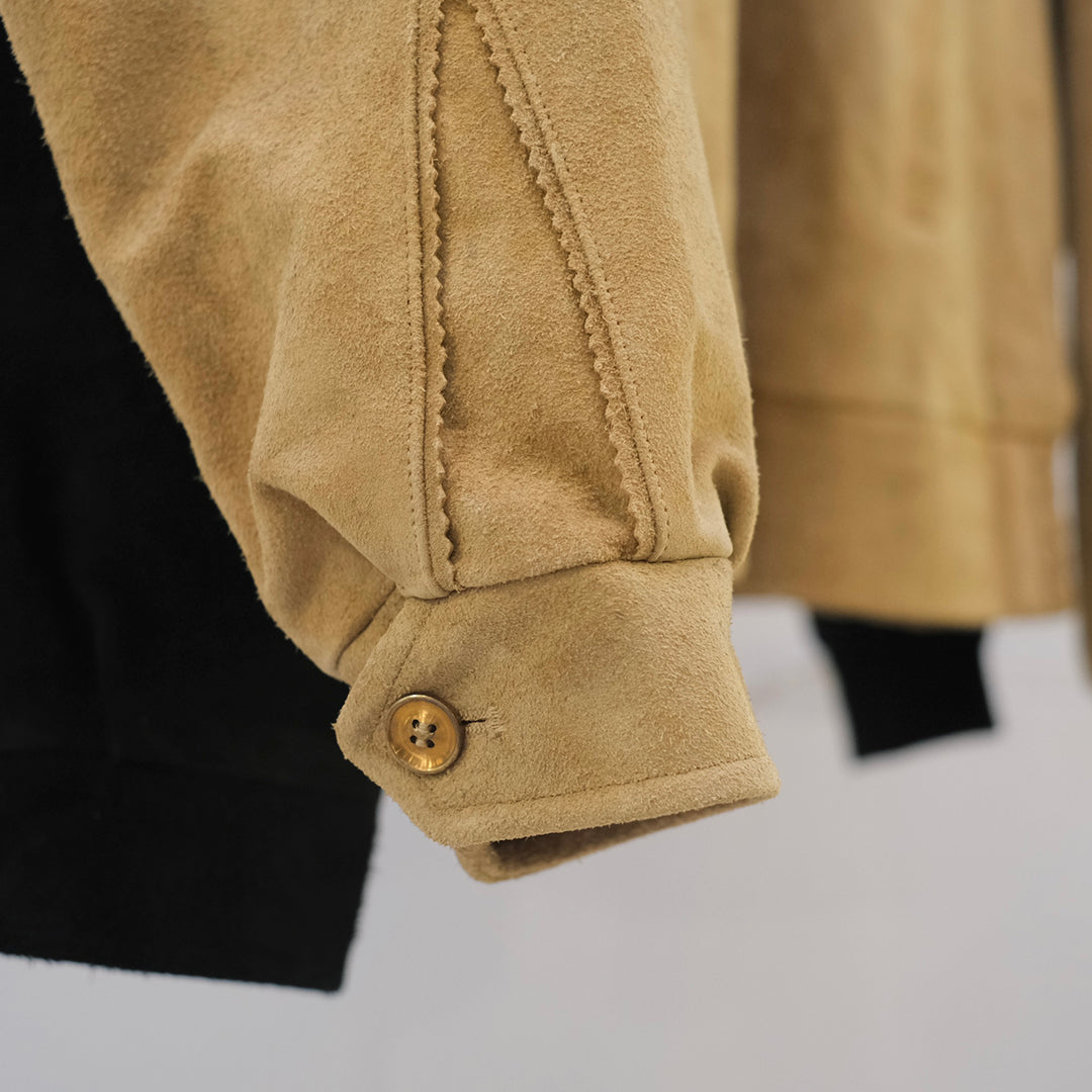 個体によっては、均一な毛足のスウェードとラフアウトのような毛並みが一定ではない箇所が部分的に混ざっていたり、浅いバラ傷は隠さずそのままにしていたり、程よい野性味を感じられて非常に好みです。共地のピンキングテープを挟み込んだ仕様も洒落ています。