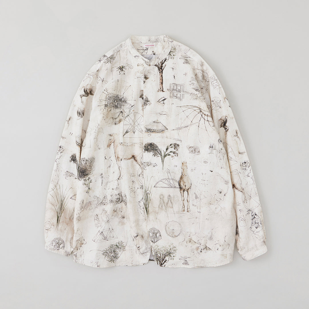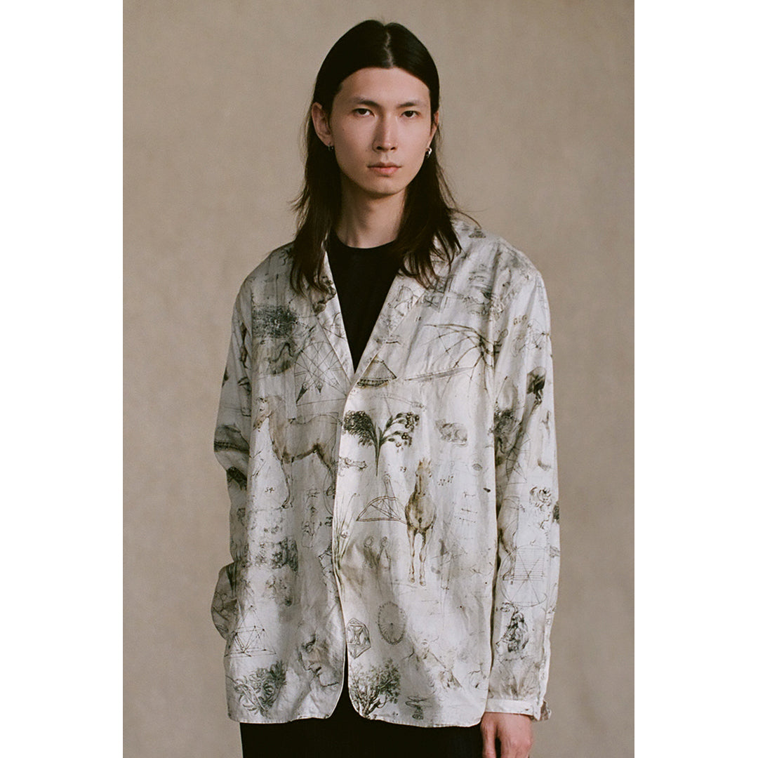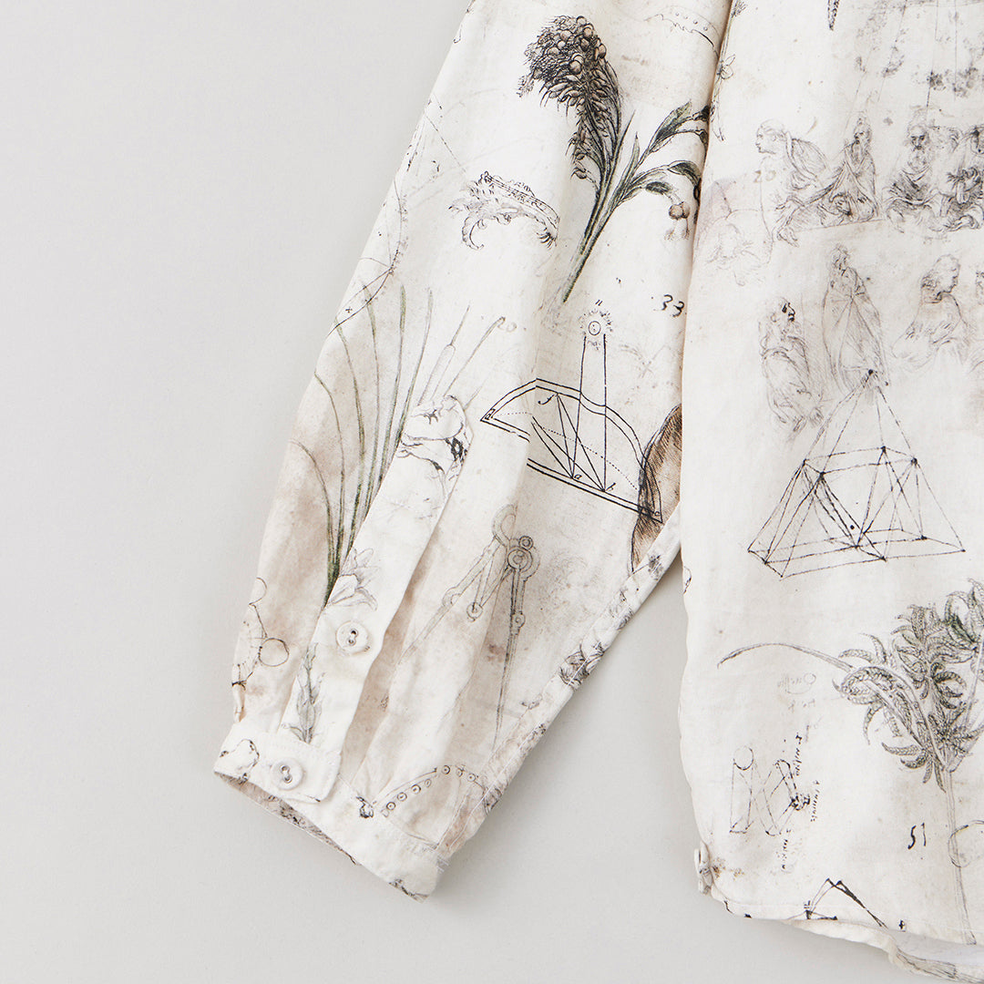 レオナルド・ダ・ヴィンチをインスピレーション源に作成したオリジナル柄をプリントしたビエラ素材のナローカラーシャツジャケット。