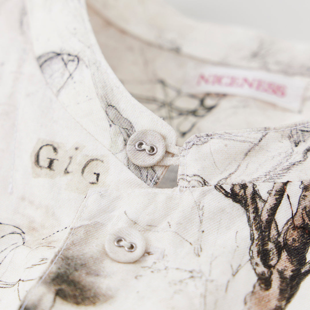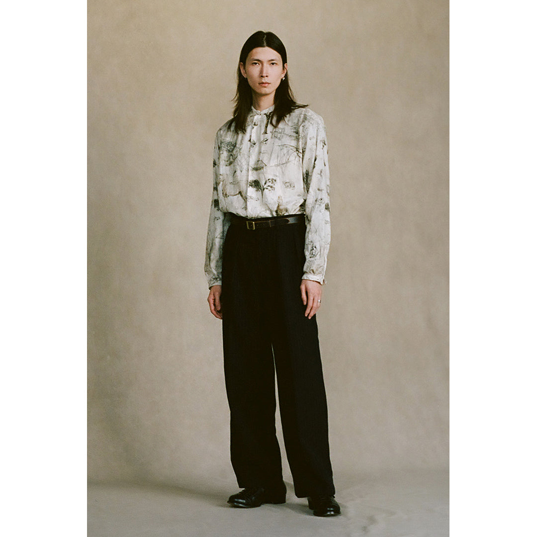 This narrow-collar shirt jacket is made from viyella fabric printed with an original pattern inspired by Leonardo da Vinci. The design draws on elements of 1920s French dress shirts, American shirting, and 1930s sack coats, reinterpreted in a modern context. When the collar is laid flat, it evokes the look of a lightweight tailored jacket. Side slits are designed with button closures for adjustable styling.